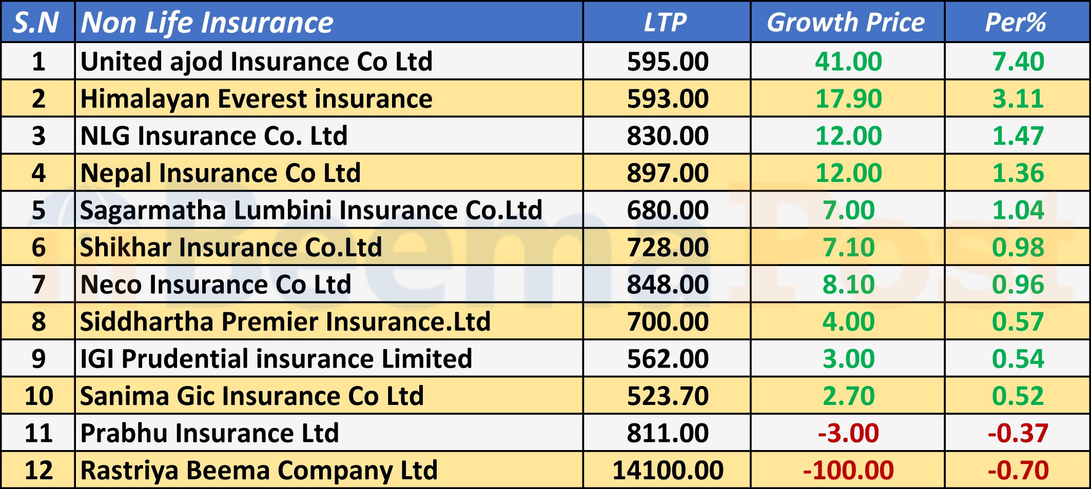 यता पाँच निर्जीवन बीमा कम्पनीहरुको शेयरमूल्य ७०० रुपैयाँभन्दा कम रहेको छ। जसमध्ये सानिमा जीआईसी र आईजीआई प्रूडेन्सियलको सर्वाधिक कम क्रमशः ५२३.७० र ५६२ रुपैयाँ रहेको छ।