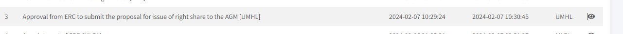 कम्पनीले माघ २२ गते बसेको बैठकले हालको चुक्ता पुँजीको १ः१ अनुपातमा हकप्रद शेयर जारी गर्ने प्रस्ताव साधारणसभामा पेश गर्न स्वीकृती दिएको जानकारी आयोगको माघ २२ गतेको २२२ औ बैठकको निर्णय आघ २४ गते अर्थात आज मात्रै नेप्सेमा सूसूचीत गरेको छ।