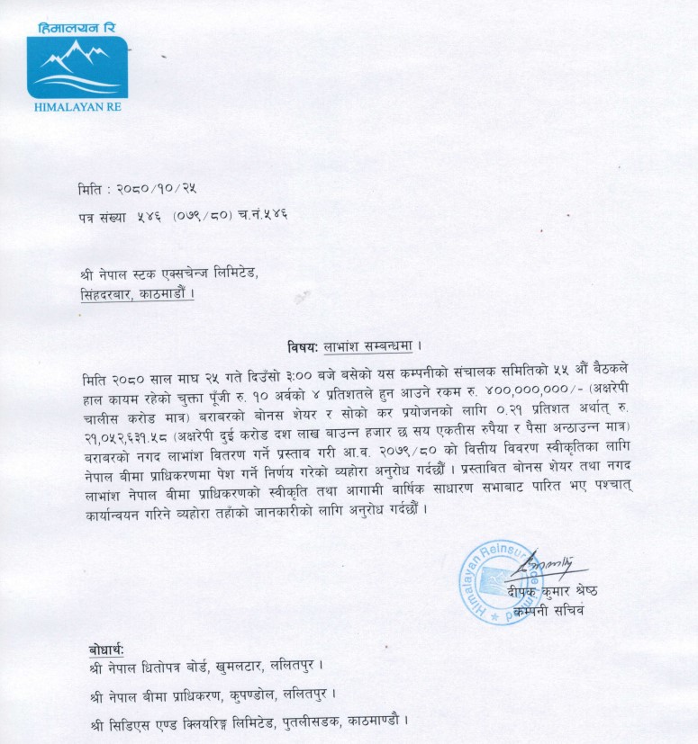 हिमालयन रिइन्स्योरेन्सको पहिलो लाभांश घोषणा, बोनस र नगद कति?