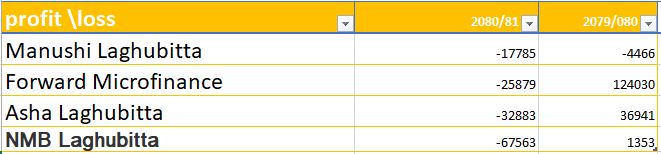 पुष मसान्तसम्ममा चार कम्पनीको नाफा ऋणात्मक अवस्थामा रहेको छ । एनएमबि लघुवित्त ६ करोड ७५ लाख ६३ हजार रुपैयाँ ऋणात्मक रहेको छ । त्यस्तै, आशा लघुवित्त ३ करोड २८ लाख रुपैयाँ, फरवार्ड लघुवित्त २ करोड ५८ लाख रुपैयाँ र मानुषि लघुवित्त १ करोड ७७ लाख रुपैयाँ ऋणात्मक रहेको छ ।