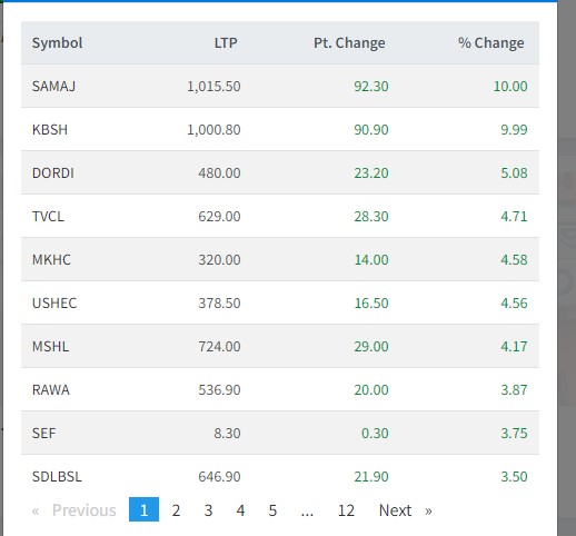त्यस्तै, दोर्दी खोला, माया खोला, त्रिशुली जलविधुत, अपर सोलु, मिड सोलु, रावा खोला, सिद्धार्थ इक्विटी फण्ड र साधना लघुवित्तको शेयर मूल्य वृद्धि भएको छ।