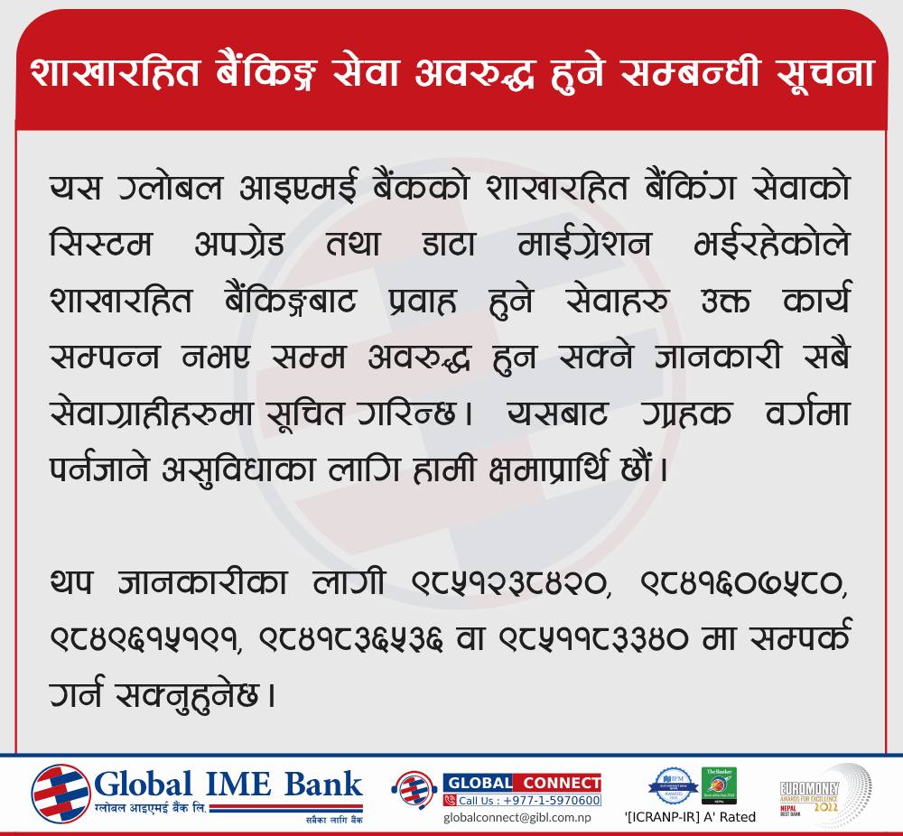 काठमाडौँ। ग्लोबल आइएमई बैंक लिमिटेडको शाखारहित बैकिङ्ग सेवा अवरुद्ध हुने भएको छ । बैंकले आइतबार एक सुचना जारी गर्दै यस्तो जनाएको हो ।