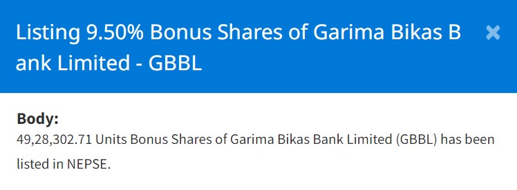 नेप्सेमा गरिमा विकास बैंकको बोनस शेयर सूचीकृत