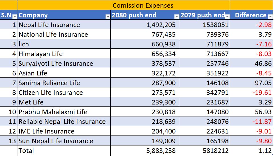 कम्पनीहरुले प्रकाशन गरेको तथ्यांक अनुसार हिमालयन लाइफले ६५ करोड ६३ लाख रुपैयाँ, सूर्यज्योति लाइफले ३७ करोड ८५ लाख रुपैयाँ, एशियन लाइफले ३२ करोड २१ लाख रुपैयाँ, सानिमा रिलायन्सले २८ करोड ७९लाख रुपैयाँ, सिटिजन लाइफले २७ करोड ५५ लाख रुपैयाँ, मेट लाइफले २३ करोड ९३ लाख रुपैयाँ अभिकर्ता कमीशनमा खर्चिएका छन् ।