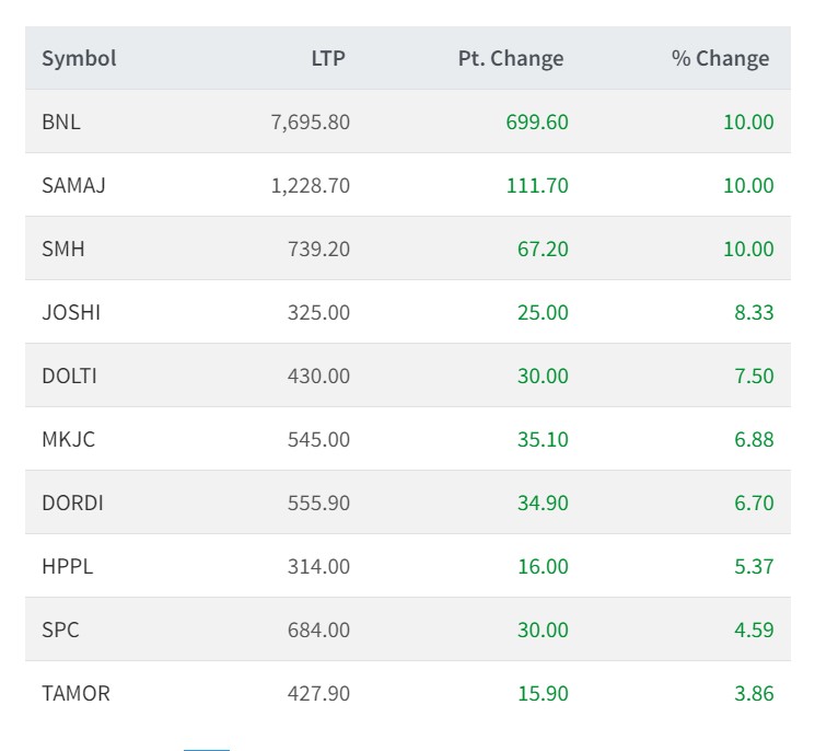 त्यस्तै, यस दिन जोशी हाइड्रोपावर, डोल्टी पावर कम्पनी, मैलुङ खोला जल विद्युत कम्पनी, दोर्दी खोला जलविद्युत कम्पनी, हिमालयन पावर पार्टनर, साम्लिङ पावर कम्पनी र सानिमा मिडल तमोर हाइड्रोपावरको शेयरमुल्य सर्वाधिक बढेको छ ।