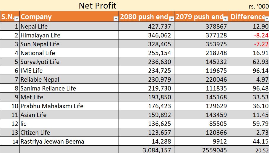 त्यस्तै, मेट लाइफको नाफा ३३.५३ प्रतिशतले बढेर १९ करोड ३८ लाख रुपैयाँ, प्रभु महालक्ष्मी लाइफको ३६.१० प्रतिशतले बढेर १७ करोड ६४ लाख रुपैयाँ, एशियन लाइफको ११.४५ प्रतिशतले बढेर १५ करोड रुपैयाँ, एनआइसी नेपालको ५९.७९ प्रतिशतले बढेर १३ करोड, सिटिजन लाइफको २.७३ प्रतिशतले बढेर १२ करोड रुपैयाँ, राष्ट्रिय जीवन बीमाको ४४.१५ प्रतिशतले बढेर १ करोड ४२ लाख रुपैयाँ मुनाफा रहेको छ ।