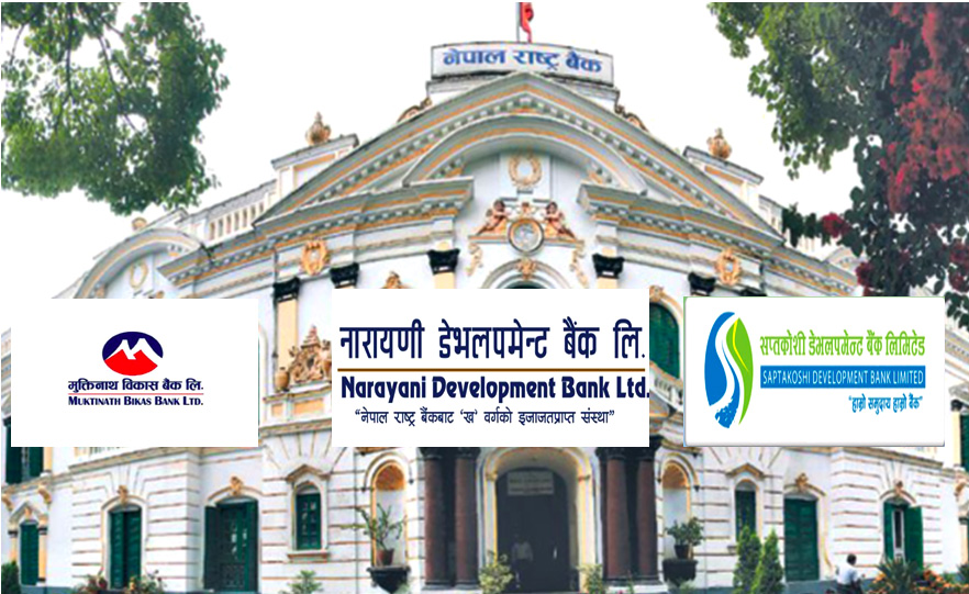 काठमाडौं। नेपाल राष्ट्र बैंकले तीन विकास बैंकलाई कारबाही गरेको छ । केन्द्रीय बैंकले मुक्तिनाथ विकास बैंक, सप्तकोशी डेभलपमेन्ट बैंक र नारायणी डेभलपमेन्ट बैंकका अध्यक्ष, सञ्चालक तथा सिईओलाई कारवाही गरेको जनाएको छ।