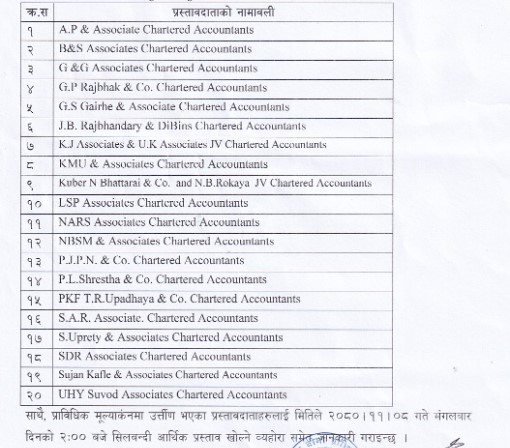 काठमाडौं । नेपाल बीमा प्राधिकरणले बीमा कम्पनीको लेखापरीक्षण गुणस्तर अभिवृद्धि गर्न लिएको परिक्षामा २० चार्टर्ड एकाउन्टेन्ट्स कम्पनीहरु चयन गरेका छन् । बीमा प्राधिकरणबाट मंसिर २५ गते प्रकाशित सिलबन्दी प्रस्ताव अनुसार परिक्षामा सहभागी भएर प्राविधिक मूल्यांकन गर्दा उत्तीर्ण भएका २० कम्पनीलाई चयन गरेको हो ।