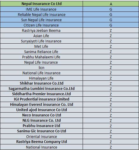 बीमा कम्पनीहरुमा नेपाल इन्स्योरेन्स मात्र वर्गिकरणको ‘ए’ मा परेको छ । अधिकांश बीमा कम्पनी जी र जेडमा परेका छन् ।