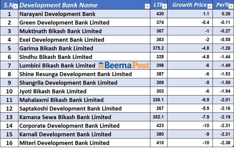 १५ विकास बैंकको सेयर मूल्यमा गिरावट, कुनको कति घट्यो ?