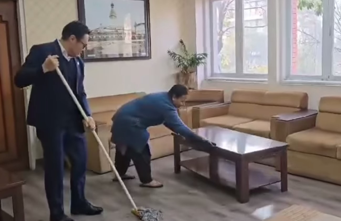 नागरिक उड्डयन मन्त्री सुदन किरातीले मन्त्रालयको कार्यकक्षमा गरे आफैं सरसफाई