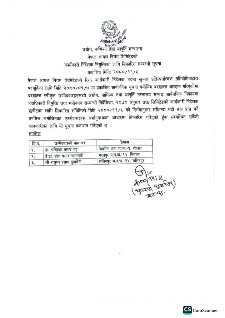निगमले कार्यकारी निर्देशकका लागि गोरखाका भट्ट, चितवनका डा.डोल प्रसाद चापागाई र ललितपुरका शत्रुघ्नप्रसाद पुडासैनीलाई सिफारिस गरेको हो ।