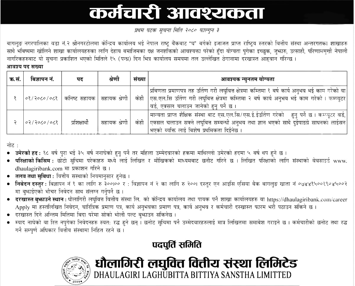 धौलागिरी लघुवित्तमा रोजगारको अवसर, एसएलसी उत्तीर्णले आवेदन दिन पाउने