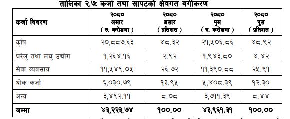 लघुवित्त वित्तीय संस्थाहरुले पुस मसान्तमा प्रवाह गरेको कुल कर्जाको ४८.९२ प्रतिशत कृषि क्षेत्रमा प्रवाह भएको देखिएको छ । २०८० असार मसान्तमा कृषि क्षेत्रमा ४८.३२ प्रतिशत कर्जा प्रवाह भएको थियो । आर्थिक वर्ष २०८०/८१ को दोस्रो त्रयमाससम्ममा लघुवित्त वित्तीय संस्थाहरुले प्रवाह गरेको कुल कर्जा मध्ये घरेलु तथा लघु उद्योग क्षेत्रमा ४.४२ प्रतिशत र सेवा व्यवसाय क्षेत्रमा २५.९१ प्रतिशत कर्जा प्रवाह भएको देखिन्छ ।