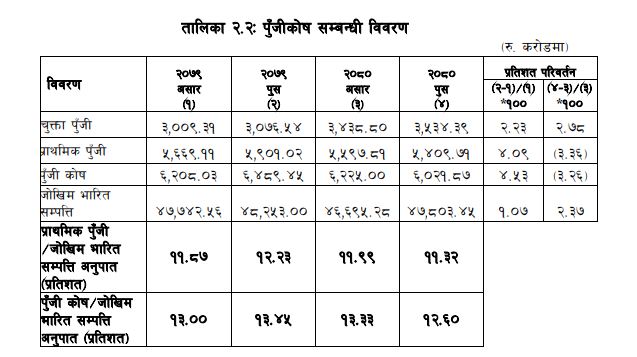 चालु आर्थिक वर्षको पुस मसान्तमा समग्रमा लघुवित्त वित्तीय संस्थाहरुको जोखिम भारित सम्पत्तिको अनुपातमा प्राथमिक पुँजी र पुँजीकोष क्रमशः ११.३२ प्रतिशत र १२.६० प्रतिशत रहेको छ । समीक्षा अवधिमा लघुवित्त वित्तीय संस्थाहरुको चुक्ता पुँजी २.७८ प्रतिशतले र जोखिम भारित सम्पत्ति २.३७ प्रतिशतले बढेको छ । अघिल्लो आर्थिक वर्षको सोही अवधिमा लघुवित्त वित्तीय संस्थाहरुको चुक्ता पुँजी र जोखिम भारित सम्पत्ति क्रमशः २.२३ प्रतिशत र १.०७ प्रतिशतले बढेको थियो ।