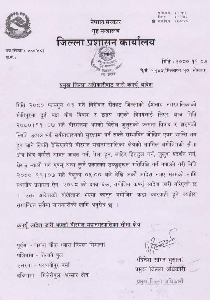 काठमाडौँ । जिल्ला प्रशासन कार्यालयले वीरगञ्जमा कर्फ्यु आदेश जारी गरेको छ।