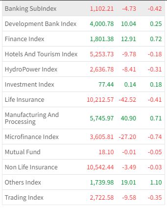 आज आठ उपसूचक ओरालो लागेको छ । मंगलबार वाणिज्य बैंकको ०.४२ प्रतिशत, होटल तथा पर्यटन समूहको ०.१८ प्रतिशत, हाइड्रोपावर समूहको ०.३१ प्रतिशतले सेयर मूल्य घटेको हो ।