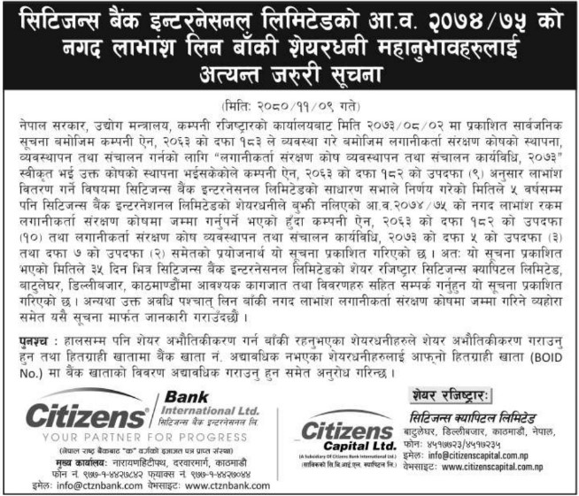 बैंकले शेयरधनीलाई आवश्यक कागजात लिई ३५ दिनभित्र सिटिजन्स क्यापिटल लिमिटेडमा गएमा लाभांश दाबी गर्न सक्ने बताएको छ ।