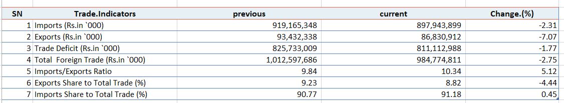 अवधिमा नेपालको वैदेशिक व्यापार ९ खर्ब ८४ अर्ब ७७ करोड ४८ लाख रुपैयाँ बराबरको भएको छ । जुन गत आर्थिक वर्षको तुलनामा २.७५ प्रतिशतले कम हो । गत वर्षको यही अवधिमा १० खर्ब १२ अर्ब ५९ करोड ७६ लाख रुपैयाँ बराबरको वैदेशिक व्यापार भएको थियो ।