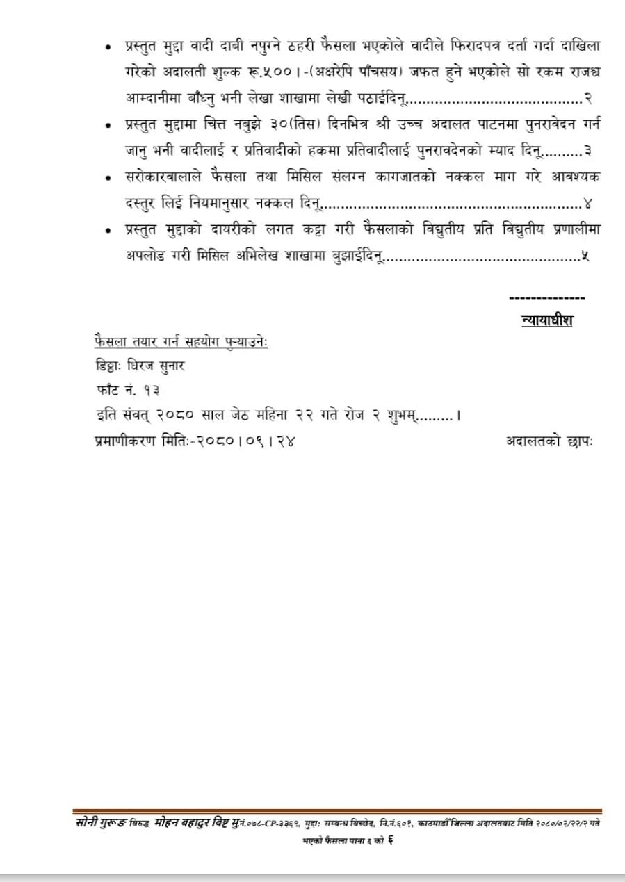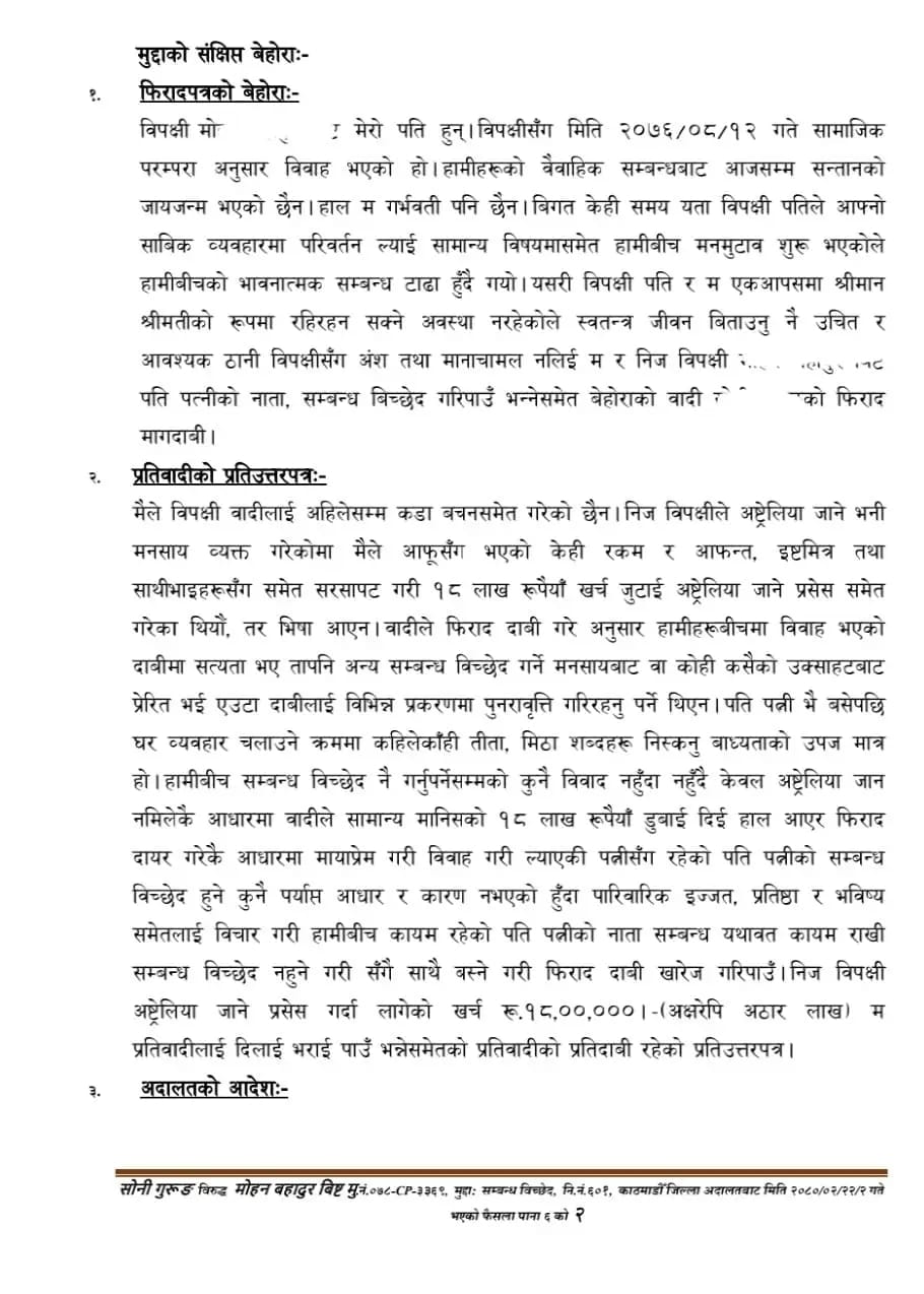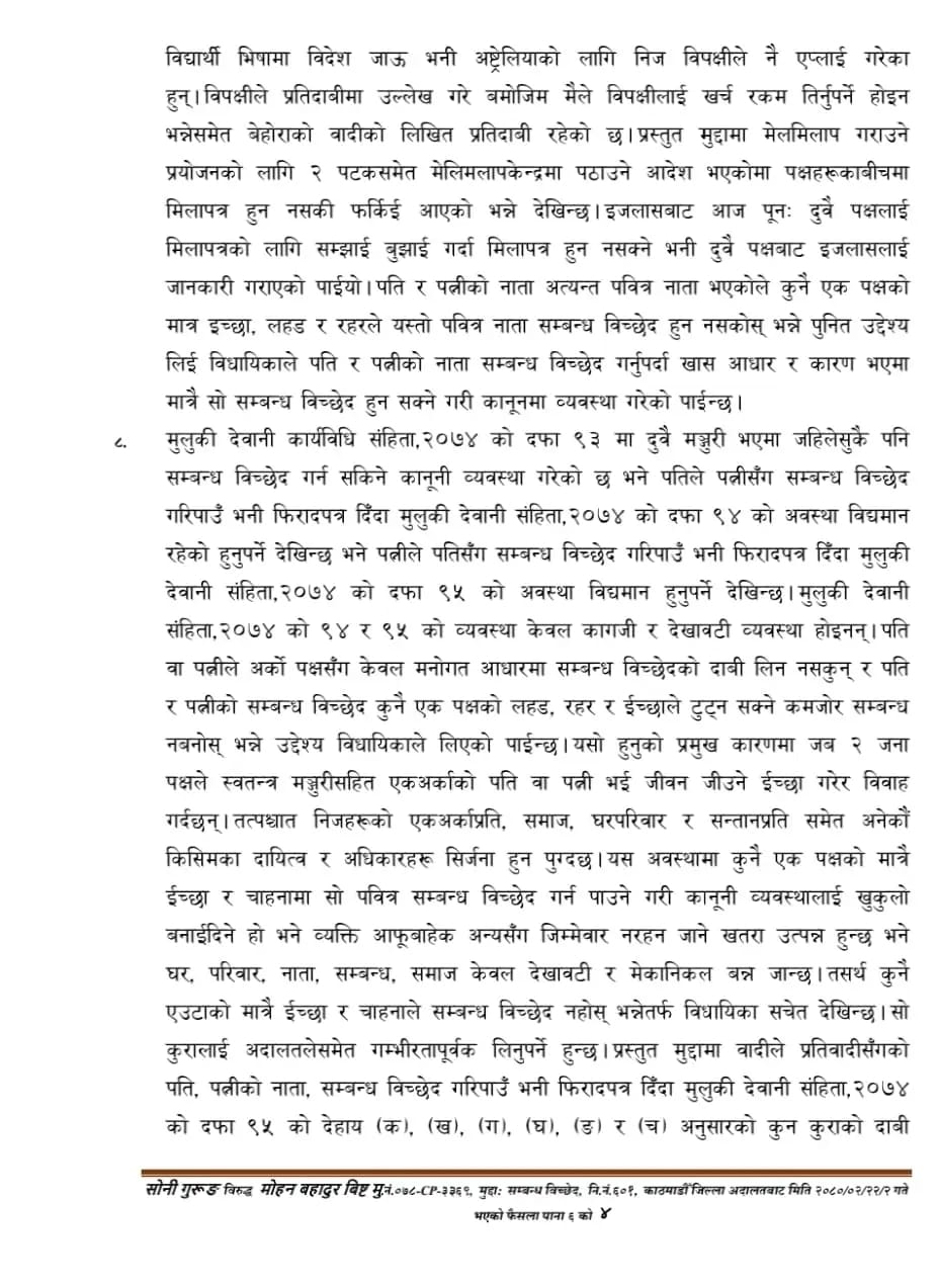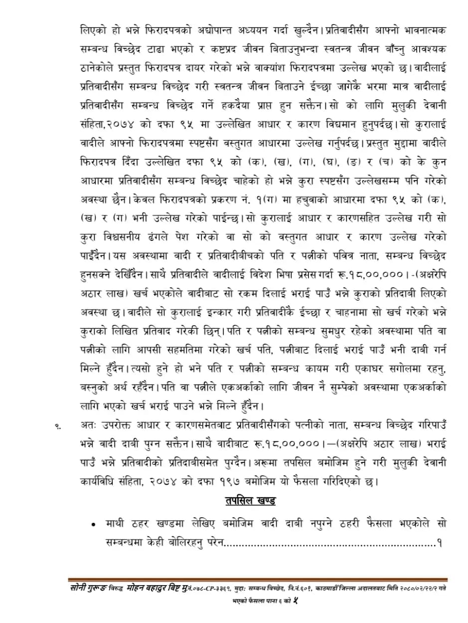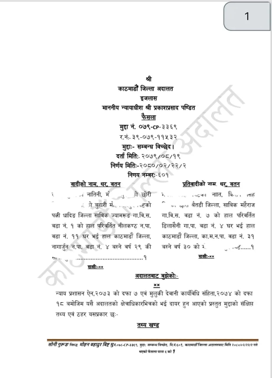 डिभोर्सबारे काठमाडौं जिल्ला अदालतको फैसलाले तरंग, महिलाले चाँहदैमा सम्बन्ध विच्छेद नहुने, (यस्तो छ, पूर्णपाठ)