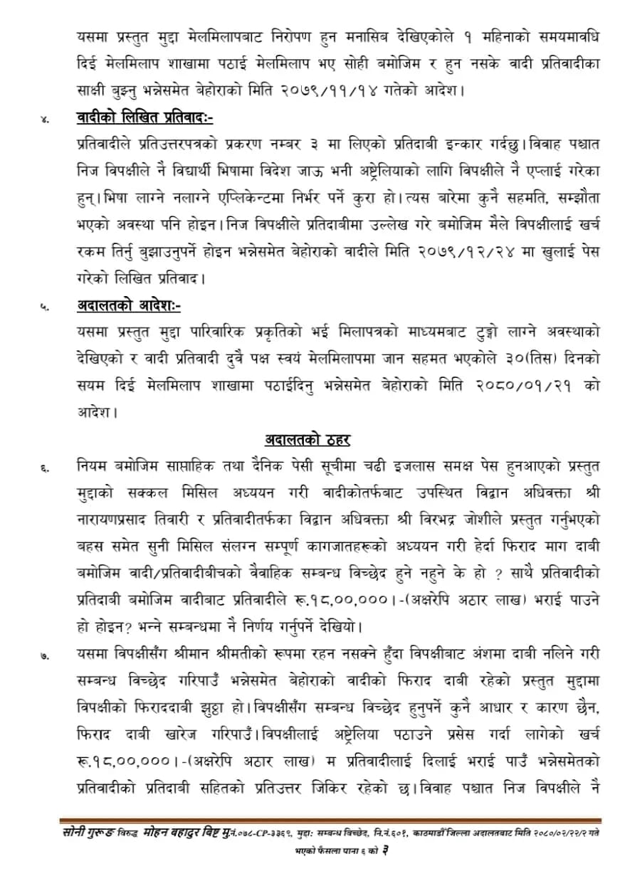 यो मुद्दामा जिल्ला न्यायाधीश प्रकाशप्रसाद पण्डितको इजलासले फैसला गर्दै वादीको दाबी नपुग्ने फैसला गरेको हो । विवाह सहजै टुट्ने किसिमको सम्बन्ध नरहेको तथा सामाजिक परम्परा अनुरुपको नाता सम्बन्ध खेलबाडको विषय नभएको भनी विधायिकाको मनसाय देखिएको ठहर पण्डितको इजलासले गरेको छ । वादीको दाबीमा सम्बन्धविच्छेद हुन सक्ने कुनै आधार नरहेको भनी फैसलामा उल्लेख छ ।