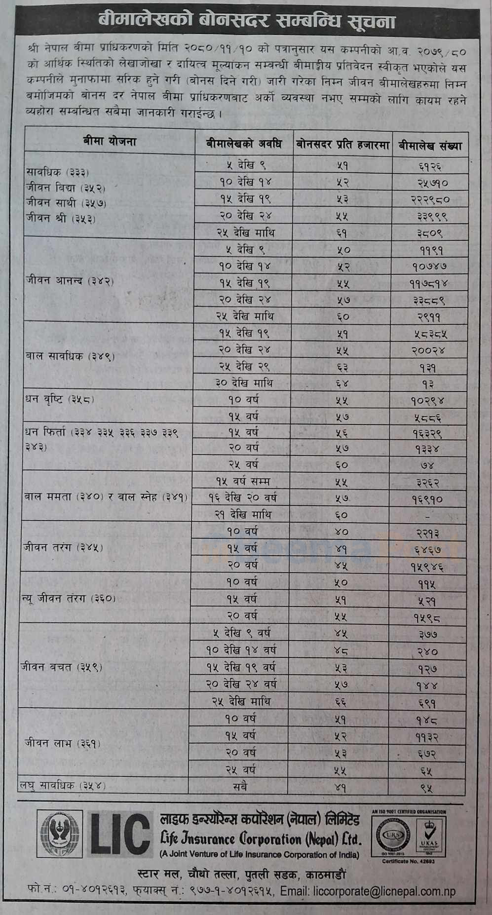 एलआईसी नेपालको नयाँ बोनसदर सार्वजनिक, कुन पोलिसीमा बोनसदर कति?