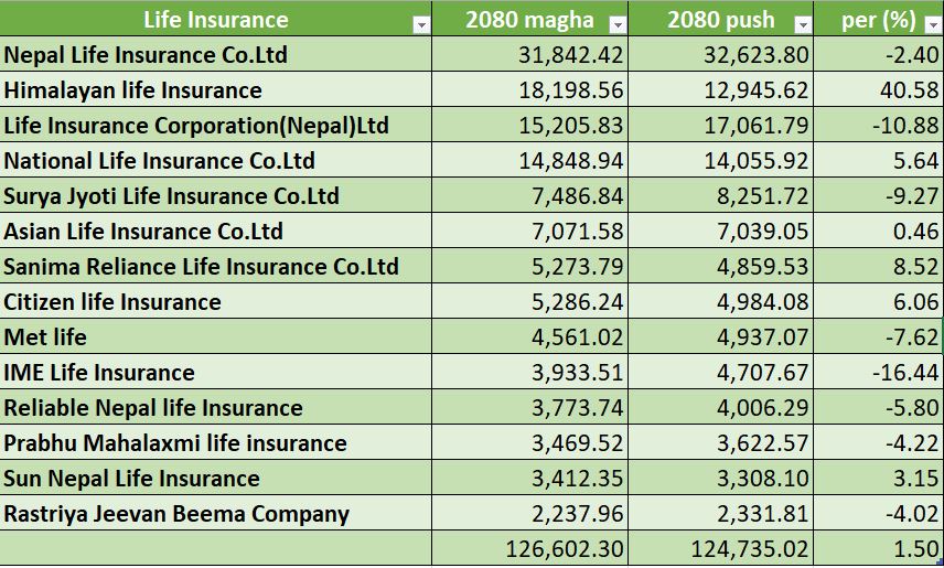 माघ महिनामा नेपाल लाइफ इन्स्योरेन्सको ब्यवसाय सबै भन्दा उत्कृष्ट देखिएको छ भने हिमालयन लाइफ र एलआइसी नेपाल र नेशनल लाइफ क्रमशः दोस्रो, तेस्रो र चौथो रहेका छन् । माघ मात्र नेपाल लाइफले ३ अर्ब १८ करोड४२ लाख रुपैयाँ, हिमालयन लाइफले १ अर्ब ८१ करोड रुपैयाँ, एलआइसी नेपालले १ अर्ब ५२ करोड, नेशलन लाइफले १ अर्ब ४८ करोड, सूर्यज्योति लाइफले ७४ करोड ८६ लाख रुपैयाँ, एशियन लाइफले ७० करोड ७१ लाख रुपैयाँ, सानिमा रिलायन्सले ५२ करोड ७३ लाख रुपैयाँ, सिटिजन लाइफले ५२ करोड ७३ लाख रुपैयाँ बीमा ब्यवसाय गरेको हो ।