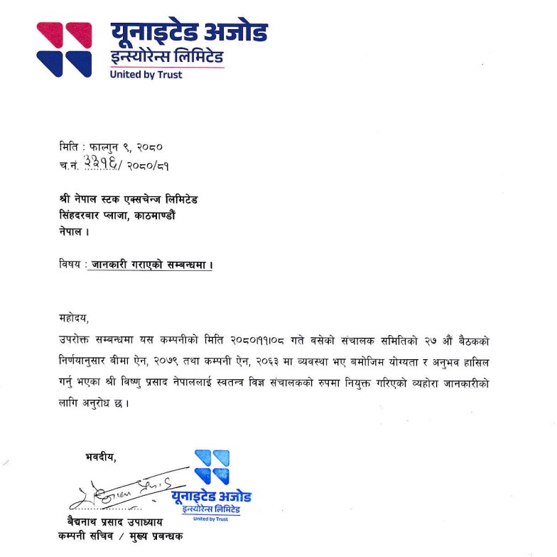 काठमाडौं । यूनाइटेड अजोड इन्स्योरेन्सको स्वतन्त्र विज्ञ सञ्चालकमा विष्णु प्रसाद नेपाल नियुक्त भएका छन् ।