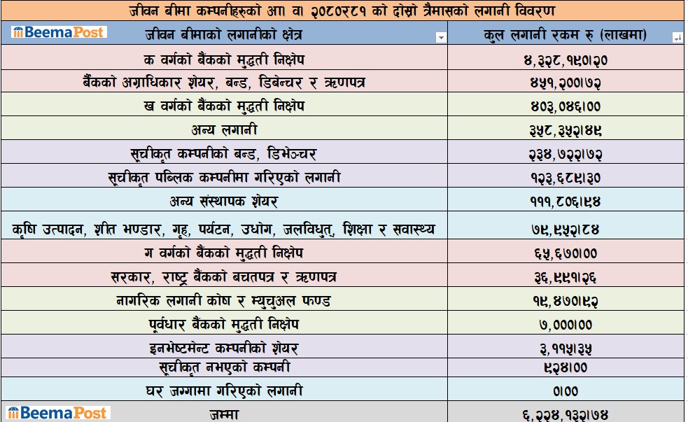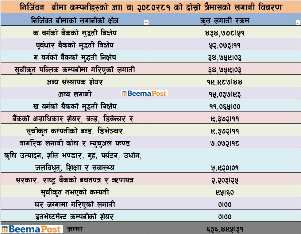 जीवन बीमा कम्पनीहरुले बैंक तथा वित्तिय संस्था सहित विविध क्षेत्रमा ६ खर्ब २२ अर्ब रुपैयाँ लगानी गर्न सफल भएको छ। निर्जिवन बीमा कम्पनीहरुले दोस्रो त्रैमासको अवधिसम्म्मा ६३ अर्ब ६४ करोड रुपैयाँ कुल रकम बैंक तथा वित्तिय संस्था सहित विभिन्न क्षेत्रमा लगानी गरेको कम्पनीहरुले प्रकाशन गरेको तथ्यांकले देखाएको छ।