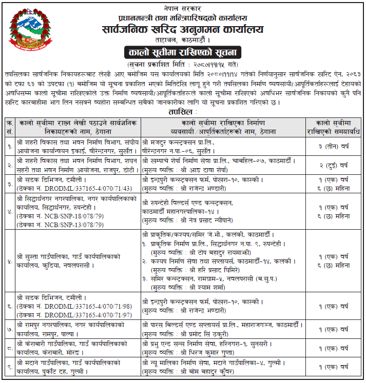 कम्पनीहरुलाई सार्वजनिक खरिद ऐन, २०६३ को दफा ६३ उपदफा (१) बमोजिम फागुन १५ गते एक सूचना जारी गर्दै आजकै मितिदेखि लागु हुने गरी कालोसूचीमा राखेको हो ।