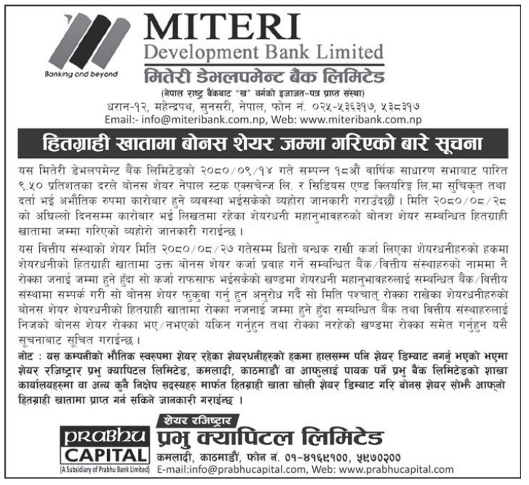 मितेरी डेभलपमेन्ट बैंकको बोनस शेयर हितग्राही खातामा जम्मा
