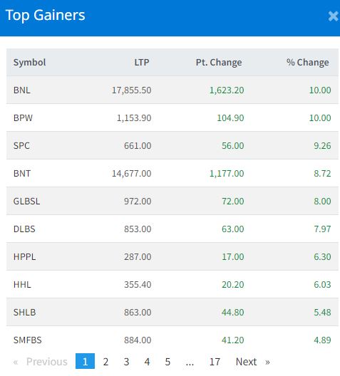 आज बोटलर्स नेपाल (बालाजु) र बिपिडब्लु लघुवित्तको सेयरमा सकारात्मक सर्किट लागेको छ । साथै, समलिङ्क पावरको ९.२६ प्रतिशत, बोटलर्स नेपाल (तराई) को ८.७२ प्रतिशतले सेयर मूल्य बढेको छ ।