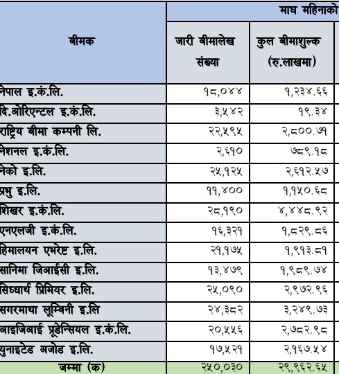 माघ महिनामा सिद्धार्थ प्रिमियरले २९ करोड ७२ लाख, राष्ट्रिय बीमा कम्पनीले २८ करोड, आइजिआइ प्रेन्डिसियलले २७ करोड ८२ लाख, नेको इस्स्योरेन्सले २८ करोड १२ लाख, एनएलजीले १८ करोड २९ लाख, हिमालयन एभरेष्टले १९ करोड १३ लाख, सानिमा जिआइसीले १९ करोड ८९ लाख, युनाइटेड अजोडले २१ करोड ६७ लाख, द ओरियन्टलले १९ लाख, प्रभुले ११ करोड ५० लाख र नेशनलले ७ करोड ८९ लाख रुपैयाँको बीमा ब्यवसाय गरेको हो ।