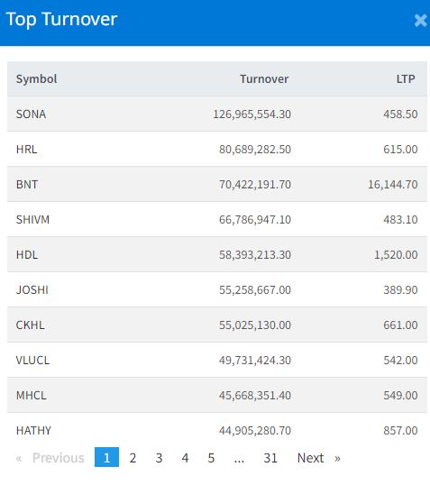 बुधबार सोनापुरको १२ करोड ६९ लाख, हिमालयन रिइन्स्योरेन्सको ८ करोड ६ लाख, बोटलर्स नेपाल (तराई)को ७ करोड ४ लाख रुपैयाँको कारोबार भएको छ ।