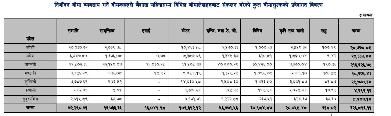 त्यस्तै, लुम्बिनी प्रदेशबाट ९.३१ प्रतिशत अर्थात् २ अर्ब ९ करोड १७ लाख रुपैयाँ, कोशी प्रदेशबाट ८.८७ प्रतिशत अर्थात् १ अर्ब ९९ करोड ३७ लाख रुपैयाँ, मधेश प्रदेशबाट ६.७७ प्रतिशत अर्थात् १ अर्ब ५२ करोड १८ लाख रुपैयाँ, गण्डकी प्रदेशबाट ५.७५ प्रतिशत अर्थात् १ अर्ब २९ करोड २३ हजार, सुदुरपश्चिम प्रदेशबाट २.७० प्रतिशत अर्थात् ६० करोड ६९ लाख रुपैयाँ र कर्णाली प्रदेशबाट ०.९९ प्रतिशत अर्थात् २२ करोड ४५ लाख रुपैयाँ कुल बीमाशुल्क आर्जन गरेका छन्।