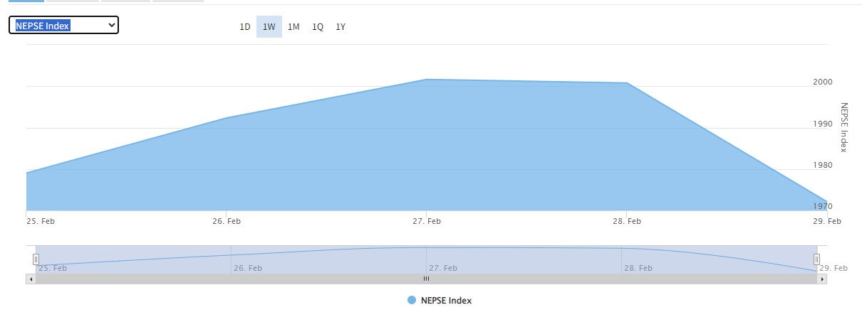 काठमाडौं । गत साता २००५ अंकमा रहेको सेयर बजार यो साता घटेर १९७२ कायम भएको छ । एक सातामा १.६४ प्रतिशत अर्थात् ३३ अंकले बजार घटेको छ ।गत साताको तुलनामा गिरावट दर केही कम हो ।