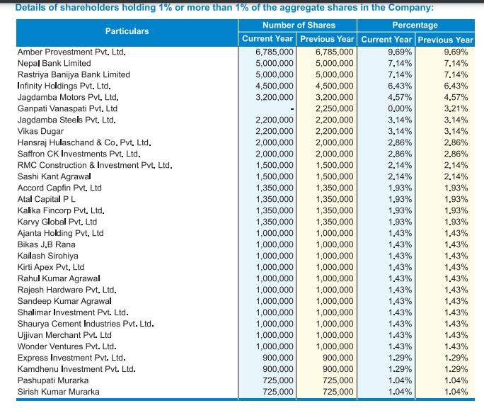 गत आर्थिक वर्षको यस अवधिमा १ प्रतिशत नजिक लगानी शिरिष कुमार मुरारका र पशुपति मुरारकाको रहेको छ । दुबैको समान १.०४ प्रतिशत लगानी रहेको छ ।