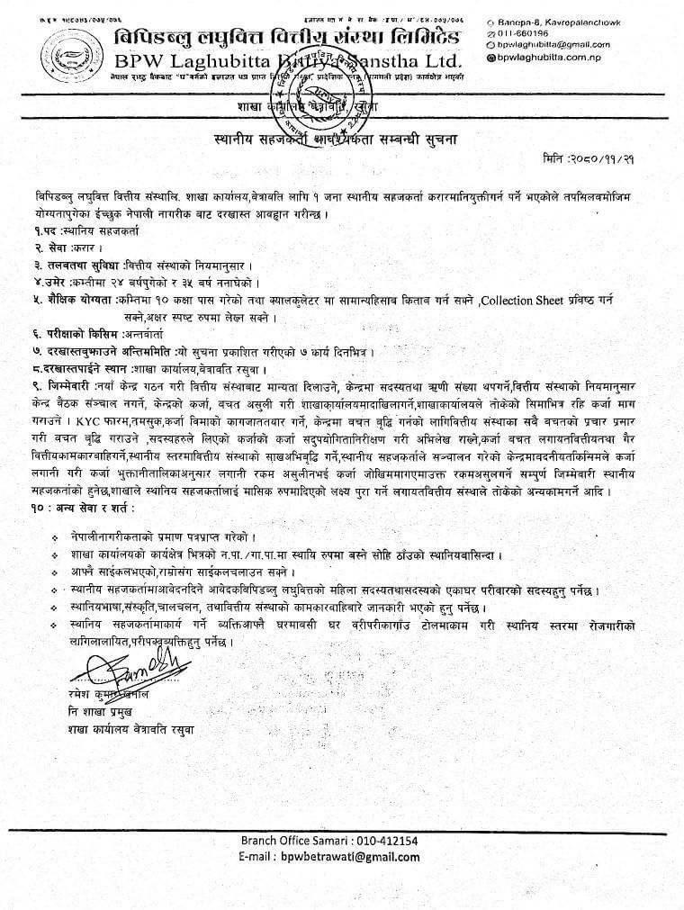 कम्पनीले शाखा कार्यालय वेत्रावतिका लागि करार अवधिमा एक जना स्थानीय सहजकर्ता मागेको छ । जसका लागि शैक्षिक योग्यता कम्तिमा १० कक्षा पास गरेको तथा क्यालकुलेटरमा सामान्यहिसाब किताब गर्न सक्ने हुनुपर्नेछ ।