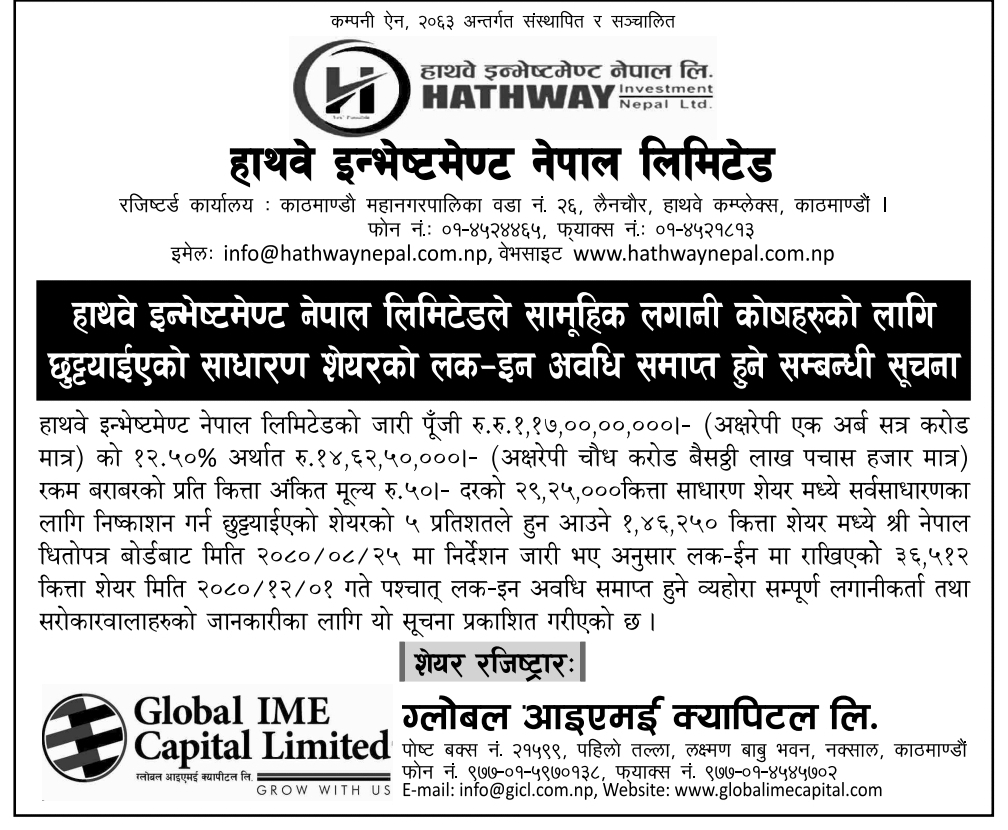 काठमाडौं । हाथवे इन्भेष्टमेन्ट नेपाल लिमिटेडले सामूहिक लगानी कोषहरुका लागि छुट्याएको साधारण शेयरको ‘लक इन’ अवधि चैत्र १ गते सकिने भएको छ । ‘लक इन’ अवधि सकिएपछि होल्ड गरिएको शेयर कारोबार गर्न मिल्नेछ ।