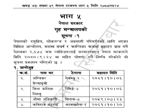 २६७४ जनाले जनही १० लाख रुपैयाँ पाउने, राजपत्रमा छापियो नयाँ शहिदको नाम
