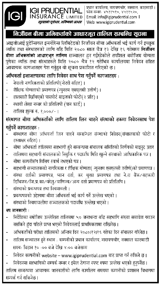 आइजीआई प्रुडेन्सियलले अभिकर्ता तालिम संचालन गर्दै, एसईई उतीर्णलाई अवसर