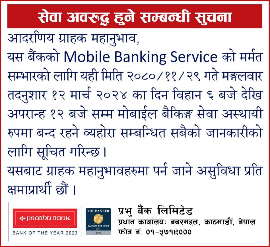 काठमाडौं । फागुन २९ गते मंगलबार प्रभु बैंक लिमिटेडको मोबाईल बैंकिङ्ग सेवा अवरुद्ध रहने भएको छ ।