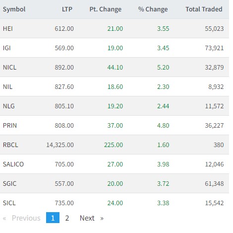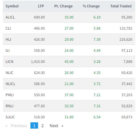 निर्जीवन तर्फ सबैभन्दा धेरै नेपाल ईन्स्योरेन्सको शेयर मूल्य वृद्धि भएको छ । नेपाल ईन्स्योरेन्स ५.२० प्रतिशतले बढ्दा प्रभु ईन्स्योरेन्स ४.८०, यूनाईटेड अजोड ४.०५, सलिको ३.९८ र हिमालयन एभरेष्ट ३.५५ अंकले बढेको छ ।