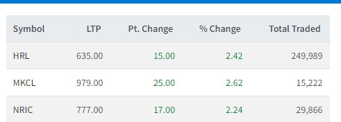 यसैगरी, प्रभु महालक्ष्मी ७.२१, सन नेपाल ६.७४, सानिमा रिलायन्स ६.६७ र सूर्यज्योति ६.५४ प्रतिशतले बढेको छ ।