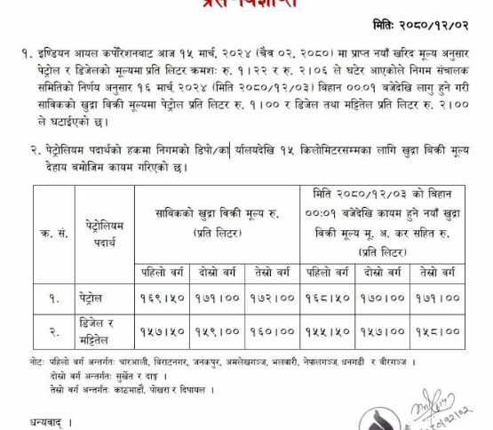 निगमले आजै मध्यरातदेखि लागू हुनेगरी पेट्रोलको १ र डिजेल तथा मट्टीतेलको मूल्य प्रतिलिटर २ रुपैयाँ घटाउने निर्णय गरेको हो।