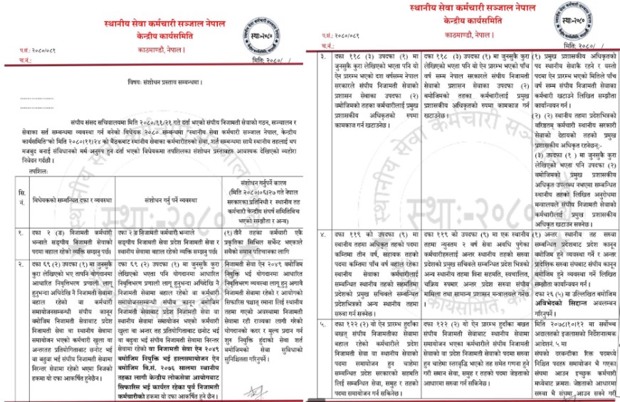 यस्तै, दफा ६९ २ मा निवृत्तिभरण सम्बन्धि व्यवस्था छ । जसमा संघका कर्मचारीलाई मात्र समेटिएको छ । यसमा पनि संशोधनको माग गरेको छ । यस्तै प्रमुख प्रशासकीयको खटन–पटनको बिषयमा पनि यसअघि स्थानीय तहका कर्मचारीसँग भएको सम्झौता अनुसार हुनुपर्ने माग राखेका छन् ।