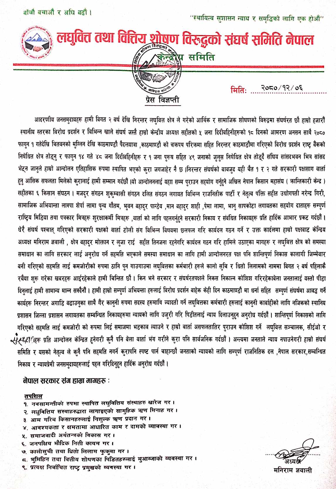संघर्ष समितिले लघुवित्त संस्था खारेज, संस्थाहरुद्धारा लगाइएको सामुहिक ऋण मिनाह, गरिब किसानहरुलाई निःशुल्क ऋण प्रदान, कालोसूची तथा धितो लिलाम फुकुवाको माग गरी आन्दोलित छन् ।
