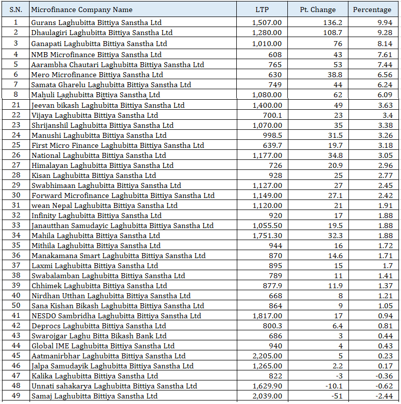 शेयर बजार ओरालो लाग्दा पनि ४७ लघुवित्तको शेयरमूल्य बढ्यो, कुनको कति ? (तथ्यांकसहित)