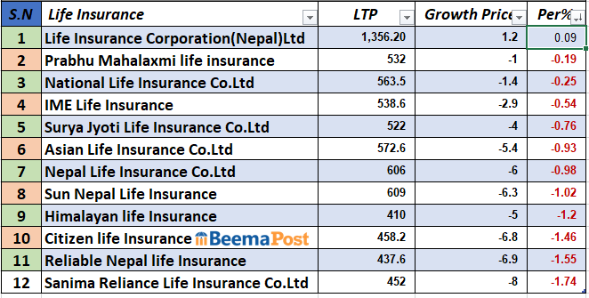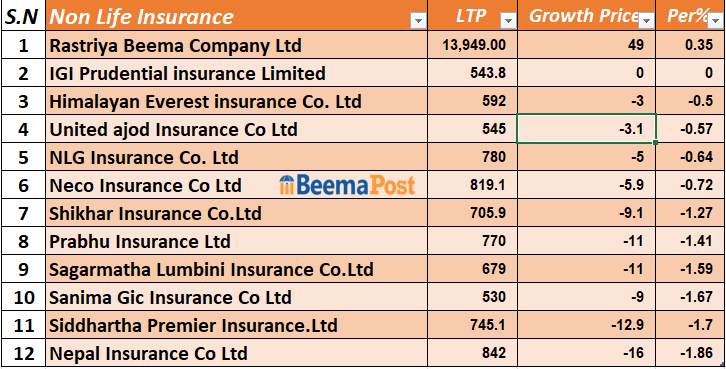 निर्जीवन बीमा कम्पनीको शेयर ८९.८० अकंले घटेर १०६६४.५६ बिन्दुमा बन्द भएको छ । यस दिन कारोबारमा आएका १२ निर्जीवन बीमा कम्पनी मध्य १० कम्पनीको शेयर मूल्य घटेको हो भने राष्ट्रिय बीमा कम्पनीको ०.३५ प्रतिशतले बढेर १३ हजार ९४९ रुपैयाँ र आइजीआइ प्रुडेन्सियलको स्थिर रहेको छ ।