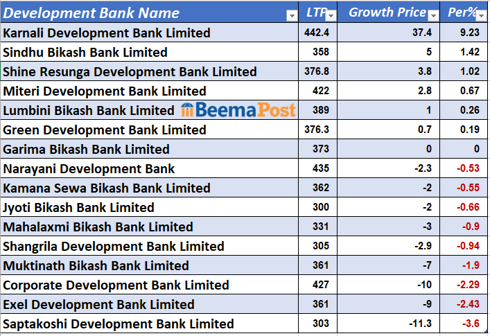 अन्तिम कारोबारको दिन सर्वाधिक शेयर मूल्य बढाउने कम्पनीको कर्णाली डेभलपमेन्ट बैंक रहेको छ । कम्पनीको शेयर मूल्य प्रतिकित्ता ९.२३ प्रतिशत अर्थात ३७ रुपैयाँ ४० पैसाले बढेर ४४२ रुपैयाँ ४ पैसा रहेको छ । यता, सिन्धु विकास बैंकको १.४२ प्रतिशत र शाइन रेसुङ्गा डेभलपमेन्टको १.०२ प्रतिशतले शेयर मूल्य बढेको छ ।